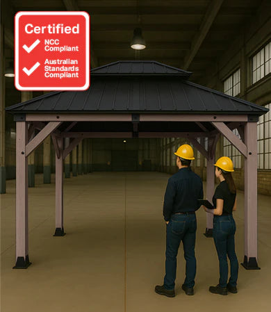 This product has been independently certified to be compliant with Australia's National Construction Code and all applicable Australian Standards. These codes determine minimum standards for strength, weather-protection and wind & fire resistance. Engineering drawings, including calculations of wind load, wood load and footing analysis, are provided with your purchase to be used when applying for relevant permits with your local council.