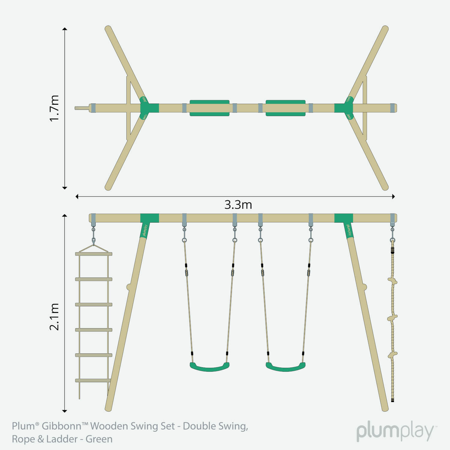 Gibbon Wooden Swing Set by Plum Play. Enjoy outdoor fun with Plum's Gibbon Swing Set! Features include two single swing seats, a climbing ladder, and rope for adventurous play. Built with premium FSC certified timber, it's robust and stable. The top bar and legs ensure safety and quality. Get ready for hours of outdoor fun and adventure!