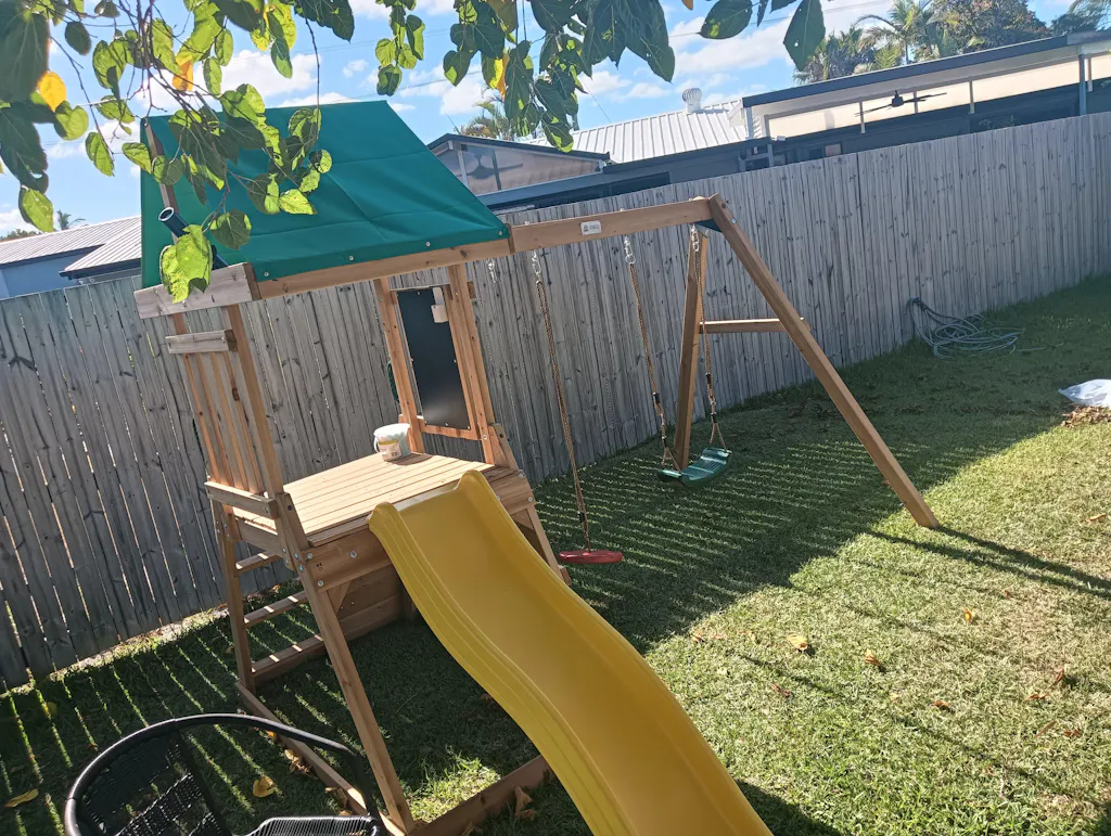 We highly recommend the Greenvale Play Centre at The Best Backyard because it’s the ideal starter swing set for young adventurers! Compact yet packed with fun features, this play centre offers a 1.8m wavy slide, a rock-climbing wall, and a 2-position swing beam with two belt swings. It’s perfect for sparking creativity and encouraging active play, making it a great fit for smaller backyards.