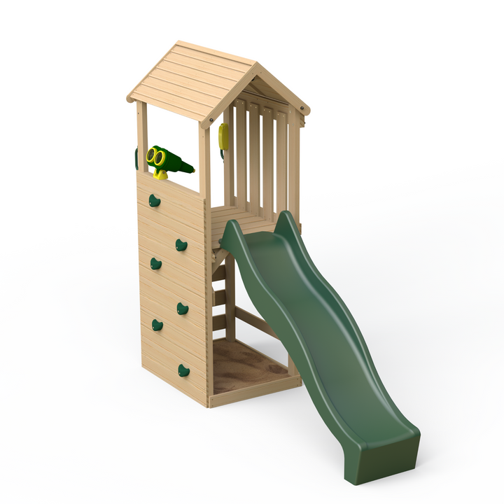 The Plum Wooden Lookout Tower is crafted from FSC-certified pine and is built to withstand all-weather conditions. Its robust construction provides a secure play environment and adheres to rigorous safety standards.