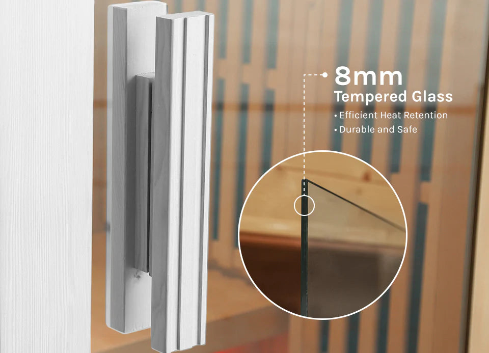The 8mm tempered glass door adds strength and stability, paired with low-EMF carbon heaters for the safest possible sauna session.