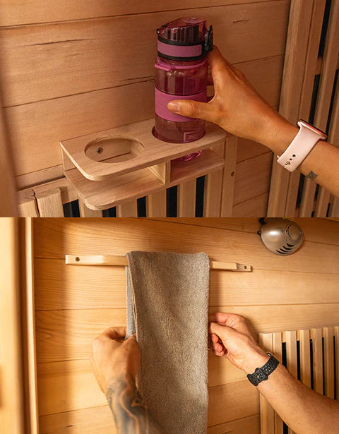 Store towels, water bottles and whatever else within easy reach, allowing you to fully relax and enjoy your time in the sauna. This thoughtful feature ensures that everything you need is right at hand.