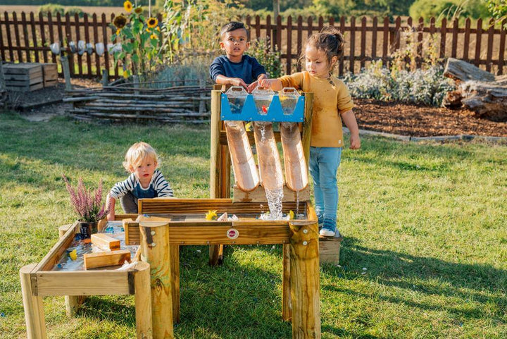 Premium add-ons make water play even more experimental. Play races down to the wooden cascade. Wooden blocks, designed for little hands, can be placed in the third and fourth reservoirs, to change water play patterns and create new routes.