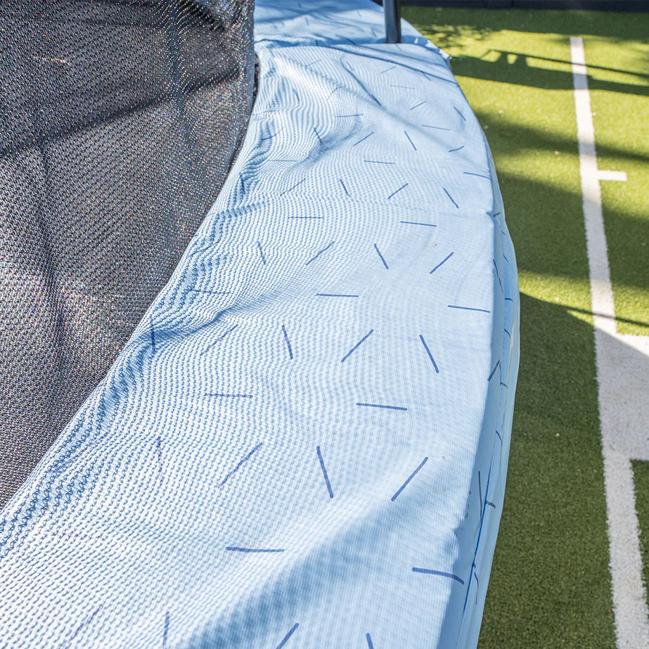 A clever net system paired with arched poles ensures that kids can safely fall onto the jump mat without touching any hard components.